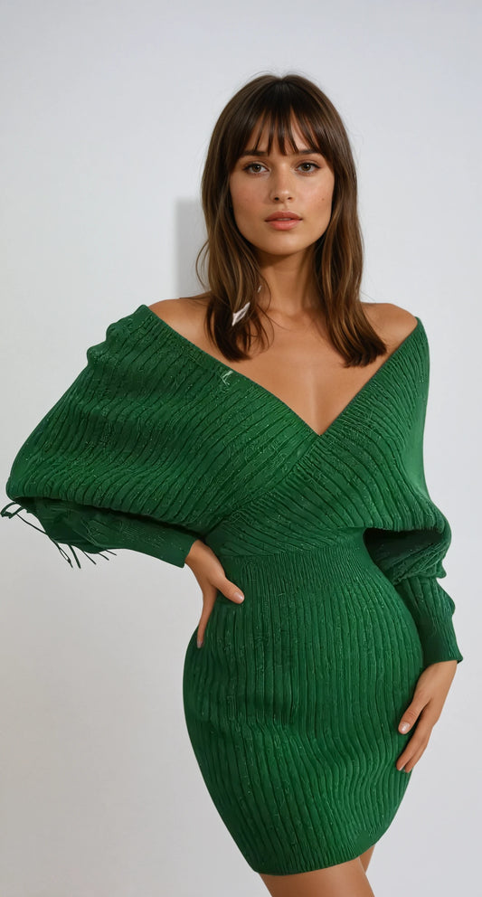 Elegant Knit Dress with Dramatic Shoulder Detail and Flattering Silhouette