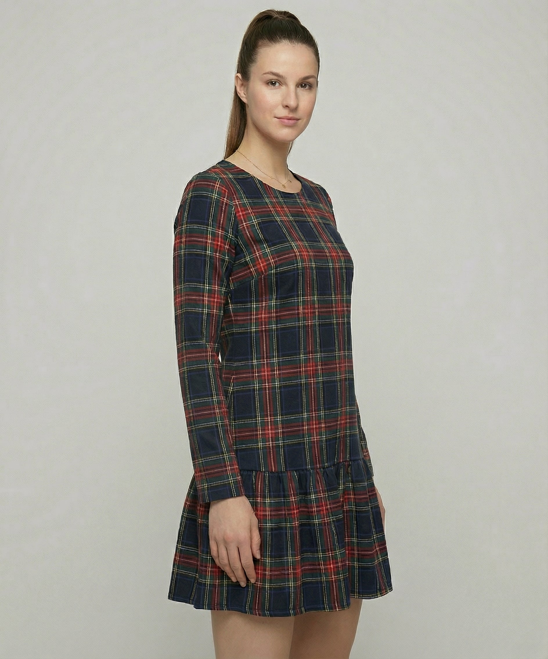 Festive Red Plaid Christmas Dress with Ruffle Details and Warm Fabric